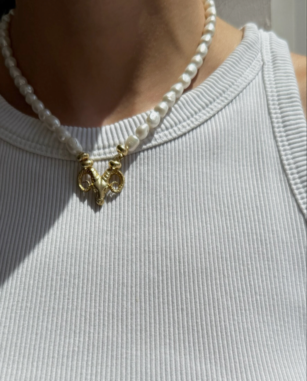 The Agrino Pearl Necklace brings contrast into harmony, pairing organic freshwater pearl with a weighty sculptural Agrino. A piece that feels ancient and contemporary at once, it is made to be worn to highlight any outfit with a bold but feminine presence.