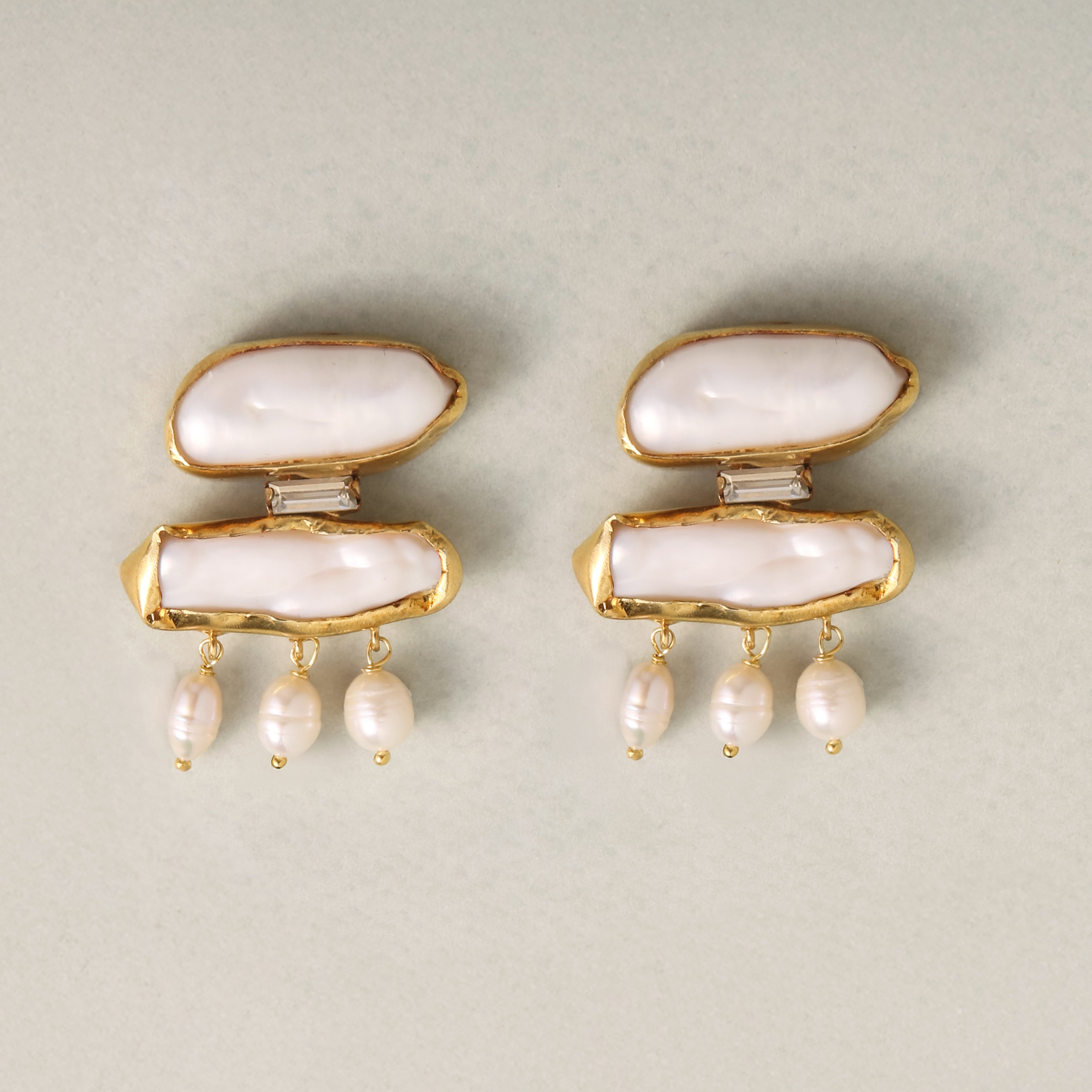 The Cleo Earrings make a bold statement with wrapped pearls and striking hanging pearls that create a dramatic, layered effect. The unique design blends modern edge with timeless beauty, offering a powerful look that commands attention. Perfect for those who want to stand out with a bold, yet refined style.