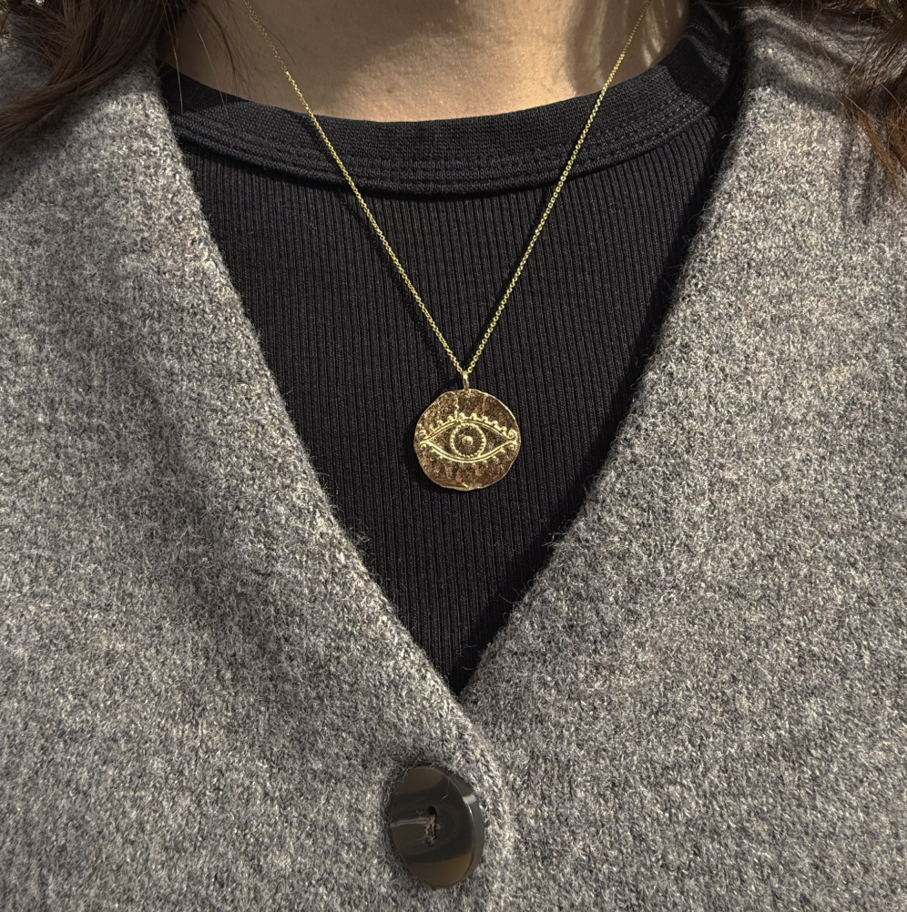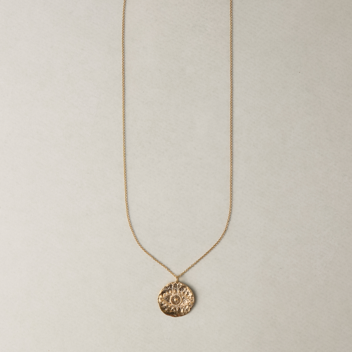 The Mati Necklace feature a sculptural eye on a coin like pendant . Softly raised it carries a centuries of meaning with a minimalist edge. Worn close to the heart it serves as both an adornment and an amulet.