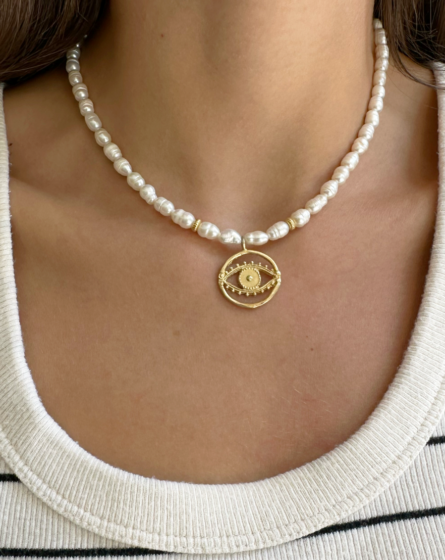 A gaze wrapped in softness the Mati on Pearls necklace brings together the ancient symbol of protection with the quiet elegance of freshwater pearls. The handcrafted eye rests at the center, watching gently, surrounded by imperfect orbs that speak to nature’s rhythm.